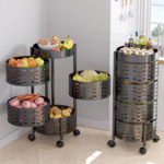 [Rotating Storage Rack] The rotating fruit basket is designed with 360° swivel wheels and 270° rotating basket, which is more convenient to take or place items from any direction. The high fence of 5.1″ protects the goods from falling down while increasing the storage space. Please watch our installation video before starting the assembly process, it will help you complete the assembly quickly and easily [Easy to Rolling] The kitchen fruit and vegetable basket serve as a rolling cart with 4 swivel casters(2 lockable) making the cart easy to roll around to anywhere you want or place in a permanent place. [Robust Material & Mesh Basket] The rotating fruit and vegetable basket owns a robust metal frame with a black baking finish. The mesh design of the wire basket allows even airflow to naturally ripen fruit and keeps your fruit vegetable fresh. [Multifunctional Storage Basket] Available as a veggie and fruit basket, kids toy bin, potato and onion storage rack, apartment essentials, baskets for gifts, suitable for the kitchen organization, home decor, bathroom, office, bedroom, laundry room, craft room, pantry, etc